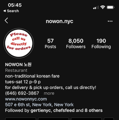 It’s never been clearer that online food delivery is unsustainable for both platforms and restaurants. Thus, restaurants need to figure out direct online ordering as soon as possible. The situation is so dire that restaurants like Nowon in East Village, Manhattan have changed their Instagram avatars to text stating “Please call us directly for orders.”