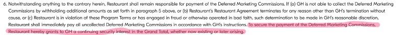 In her testimony, Grubhub’s Senior Director of Public Affairs Amy Healy referred to the $100mm in commission deferrals as an “interest free loan” despite the very clear fine print which states that “to secure the payment of the Deferred Marketing Commissions, Restaurant hereby grants to [Grubhub] a continuing security interest in the Grand Total, whether now existing or later arising.”