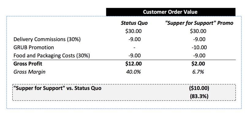 But under the promotion, bigger orders are certainly not better for the restaurant. It initially required businesses to eat the $10 discount and eventually pay full commission on the full, non-discounted order value. Dan Fleischmann, VP of the Kitchen Fund, put together the following model that explains the predatory nature of this campaign that would result in a significant 83% loss in gross profit compared to had the restaurant not participated in the promotion.