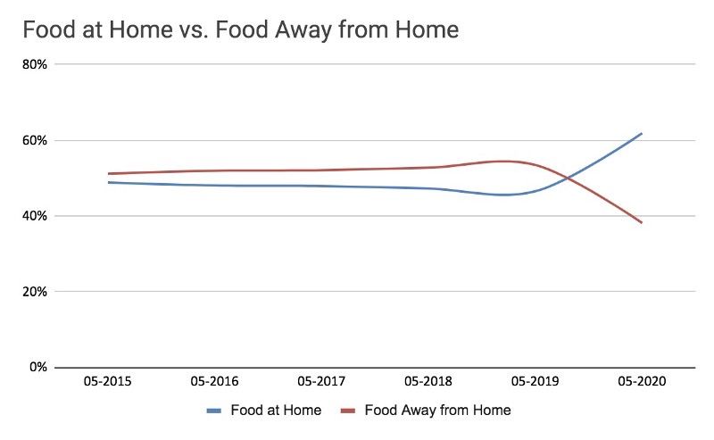 While the last decade has seen “food away from home” (restaurants, bars, delivery, etc.) surpass “food at home” (grocery, convenience stores), the trend has strongly reversed over the past four months. Compared to May 2019, restaurants and drinking places experienced a 39% decline in May 2020 while food and beverage stores saw a 15% increase in sales over the same period.