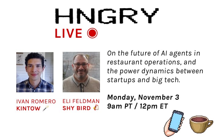 The HNGRY Trends community is hosting a members-only live roundtable and Q&A next Monday with Ivan Romero of AI restaurant copilot Kintow and Boston-based Shy Bird operator Eli Feldman about how restaurants will leverage AI agents to power their daily operations. We'll dive into the current set of vendors, how they plan to help operators, and who is poised to win in the space.