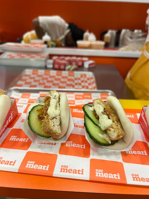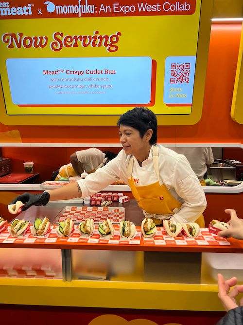 If one thing was clear, it was that Meati spent boatloads to make sure everyone knew that it had finally arrived. It had a food truck greeting everyone at the entrance, staircase ads in the Hot Products hall, and a booth sitting side-by-side with Momofuku Goods, the CPG line of its namesake restaurant. I sampled chicken and waffles, a carne asada skewer, a Momofuku Crispy Cutlet bao bun, and plain old Meati steak for good measure. Like most meat alternatives, Meati truly shines as a prepared ingredient rather than a center-plate protein.