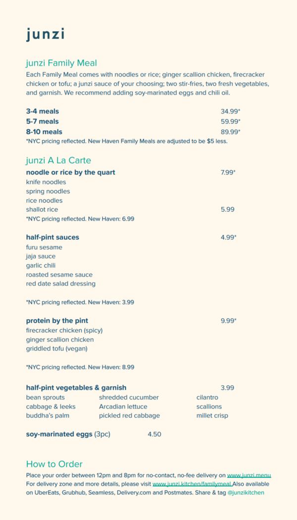 As soon as restaurants were forced to shut down their front-of-house, junzi was prepared to launch its new delivery/takeout-only menu composed of select items that have lower food and labor costs, slashing items like beef and sauces containing egg and tomato. In addition, the new menu contains family meals ranging from 3–10 servings for an average cost of $10/meal. These come with rice or noodles; firecracker chicken, scallion chicken, or tofu; two stir-fries, two fresh vegetables, choice of junzi’s own sauces and garnish. It also sells proteins and its homemade sauces by the pint, and recommends adding your own soy-marinated egg and chili oil to spice it up. The team plans to start live streaming on Twitch and TikTok to provide cooking tips on what to make in your fridge- junzi sourced or not.