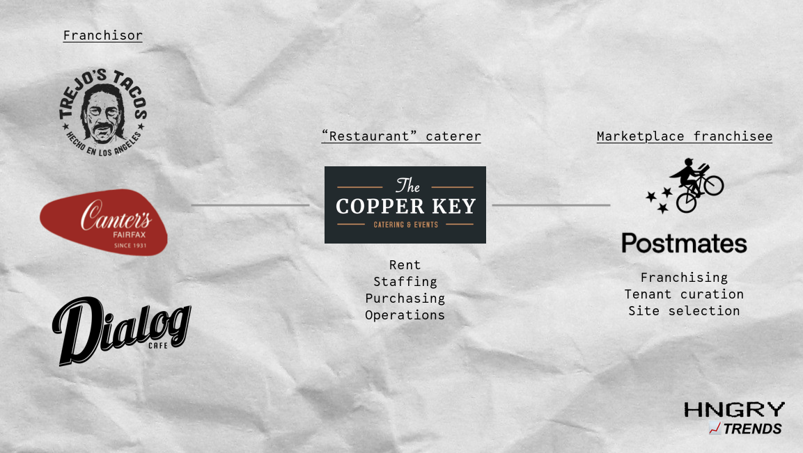 About three months ago, Postmates sought counsel from foodservice experts who suggested it tap the expertise of caterers like Michael Duddie, owner of The Copper Key. Before the pandemic, his business was focused on supporting large 500-person galas for celebrity chefs like Nancy Silverton (Mozza, chi SPACCA, Triple Beam Pizza, La Brea Bakery) where his culinary crew would be responsible for executing her menu. The Copper Key has catered events for large corporates such as Netlfix, Hulu, Amazon, Spotify, Snap, and Nike. Now, Duddie has transformed his existing catering kitchen in the former renowned French restaurant, Spring, to cook all of the licensed brands. Postmates has an agreement where it licenses limited menus of top-performing restaurants and charges him a below-market commission to sell items under those names from his space. Brands receive a royalty of its sales and train Duddie’s staff while he is ultimately responsible for hiring cooks, purchasing food from the brands’ suppliers, paying rent, and operating the business. All brands are curated by and sold exclusively on Postmates.