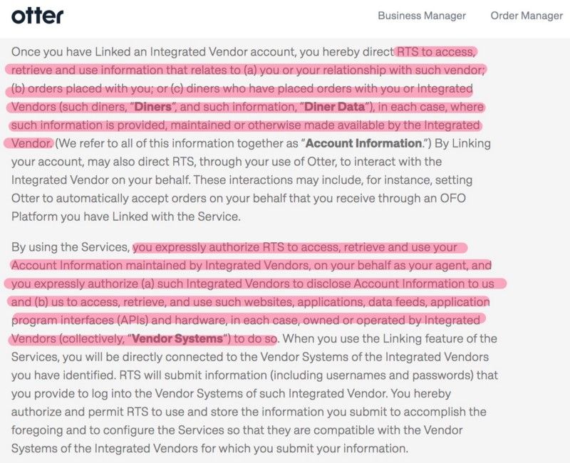 CloudKitchens has Otter, its own version of Ordermark that it provides to its tenants and other restaurants looking to streamline their third-party marketplace integrations. Naturally, CloudKitchens has not publicly associated its brand with Otterās and has egregious data privacy terms that allow the company to take advantage of unsophisticated restaurateurs. The terms shown below from Otterās website would hand over all of a restaurantās sales data to CloudKitchens which could presumably be used to create competing brands, as it has already demonstrated through facility brands it licenses to various tenants, food trucks, and non-affiliated restaurateurs.